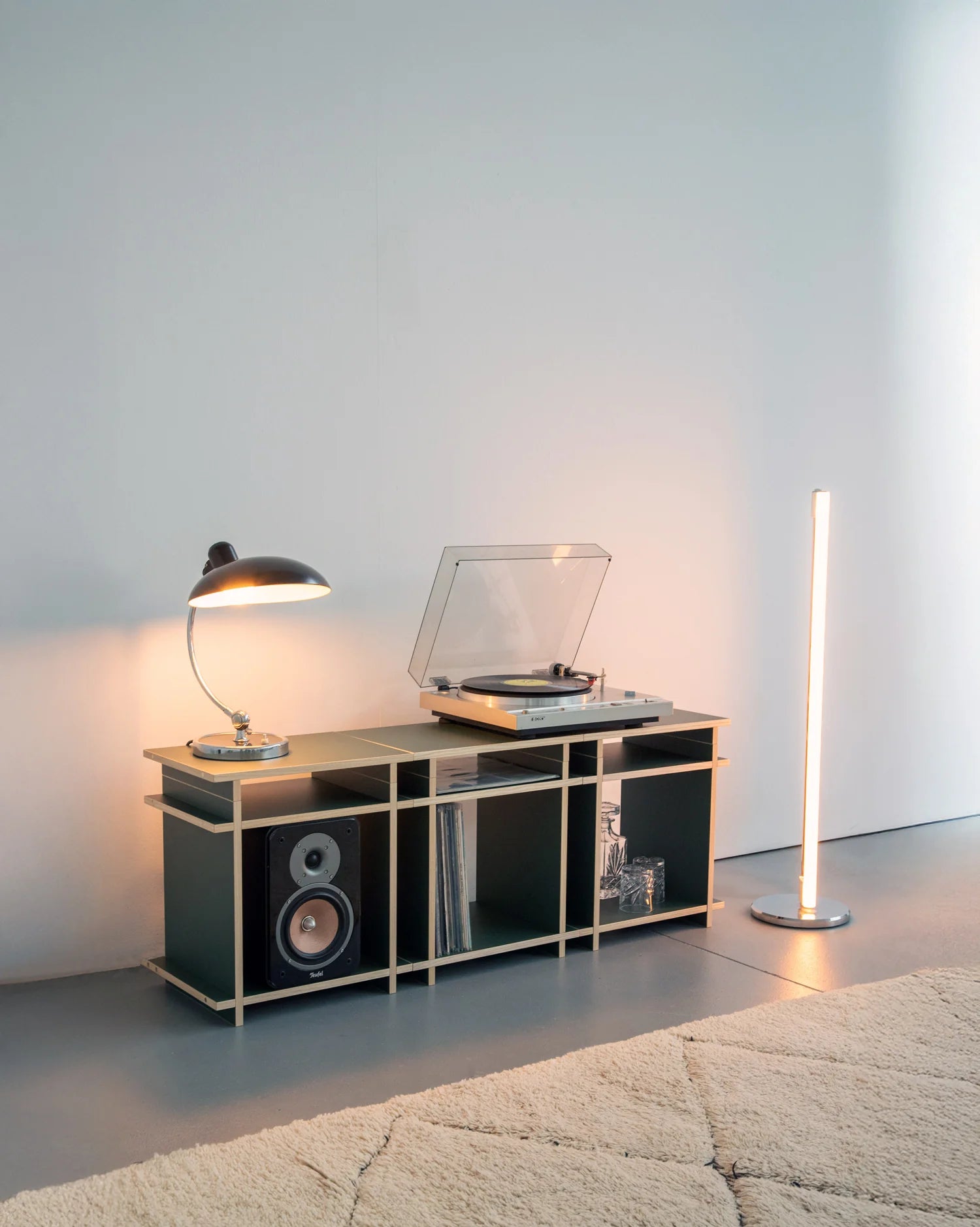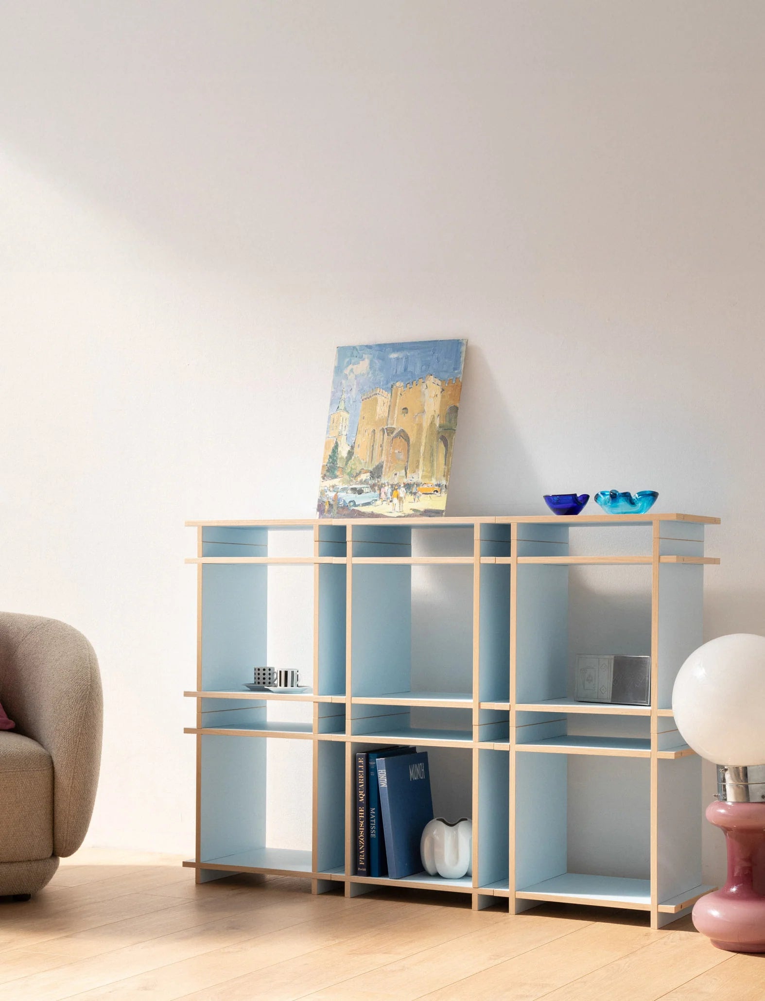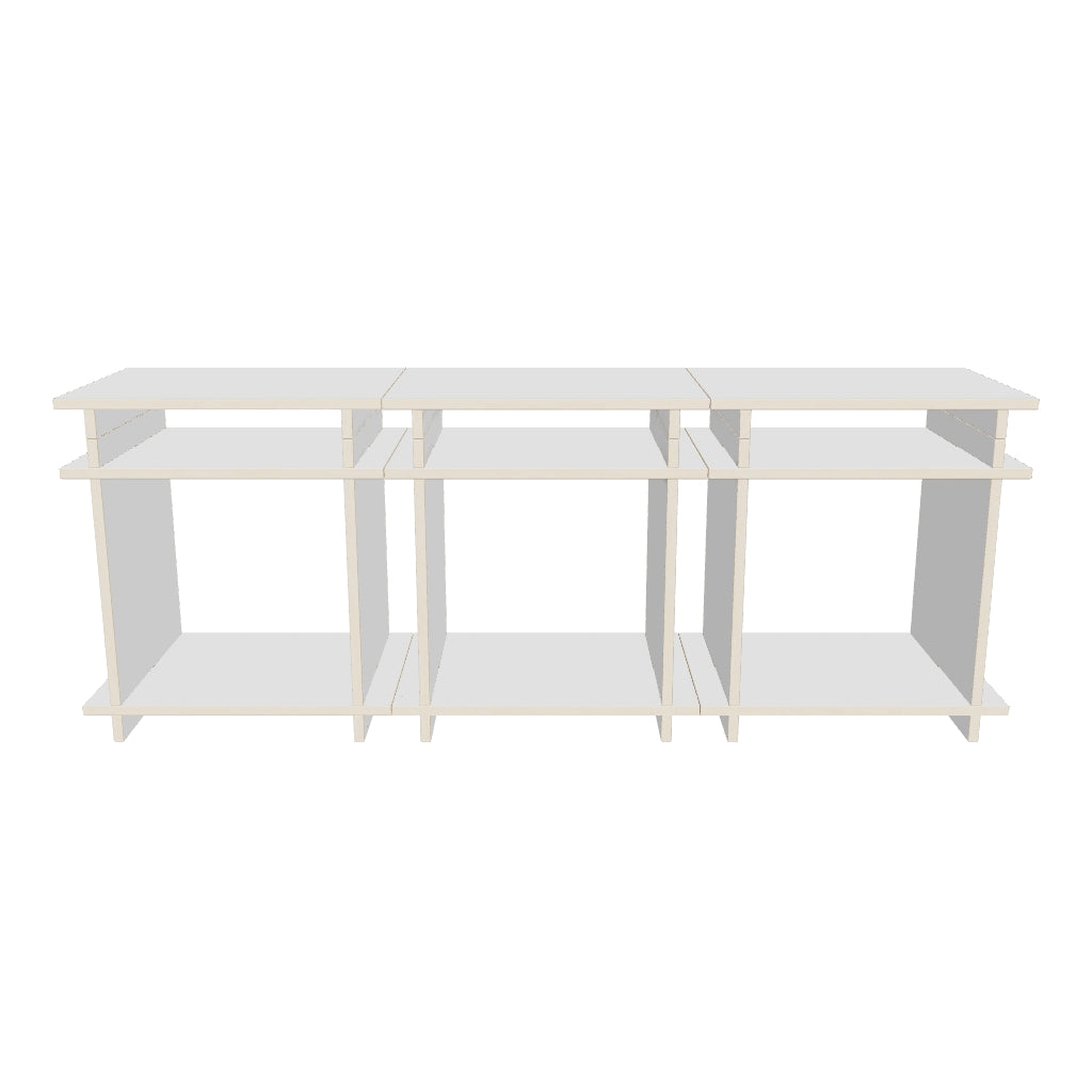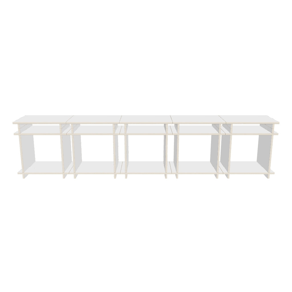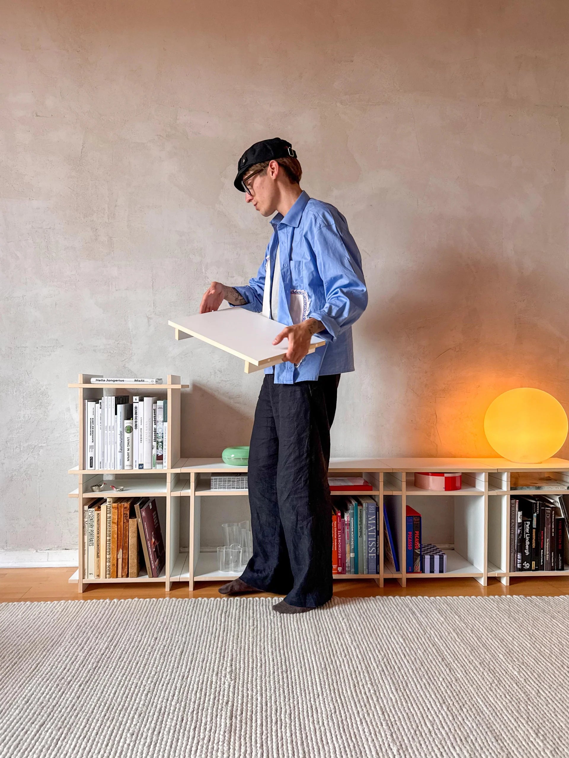 Two elements: Cubes & Caps. Invisibly connected by magnets. Designed for shelves, room dividers, sideboards, or bedside tables – modular, stable, timeless.